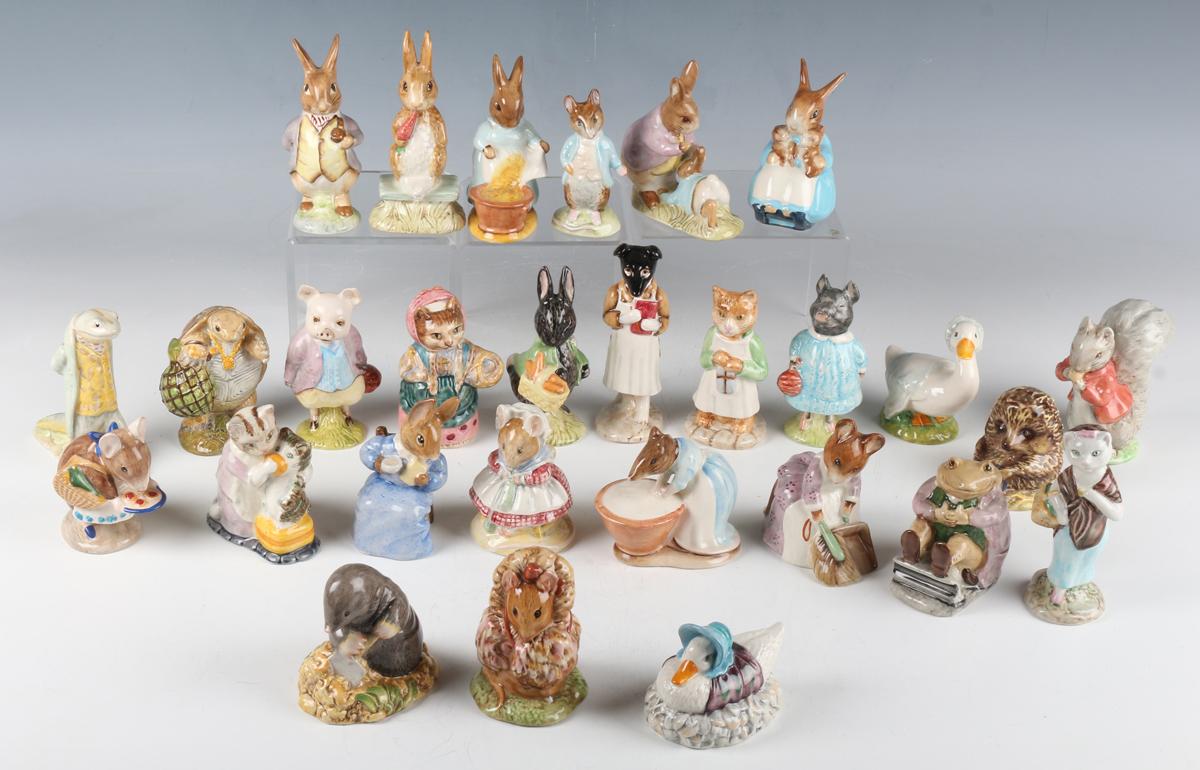 Twenty-eight Beswick Beatrix Potter's figures each with mark BP-3b, comprising Pickles, Ginger, Old Mr Pricklepin, Rebeccah Puddle-Duck, Mr Alderman Ptolemy, Mrs Rabbit and Bunnies, Pig-Wig, Little Black Rabbit, Tabitha Twitchit and Miss Moppet, Cottontail, Mr Benjamin Bunny and Peter Rabbit, Cousin Ribby, The Old Woman Who Lived In A Shoe Knitting, Pigling Bland, Anna Maria, Diggory Diggory Delvet, Appley Dapply, Hunca Munca Sweeping, Mr Jackson, Sir Isaac Newton, Susan, Cecily Parsley, Johnny Town-Mouse, Jemima Puddleduck Made a Feather Nest, Thomasina Tittlemouse, Mr Benjamin Bunny, Fierce Bad Rabbit and Timmy Tiptoes.