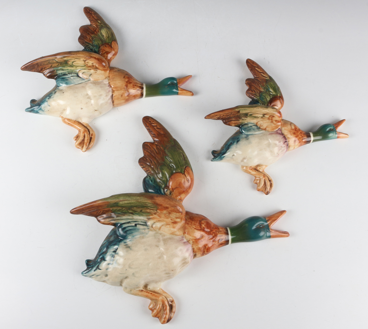 A graduated set of three Beswick wall plaques in the form of flying mallard ducks, comprising Nos. 596-0, 1 and 2 (largest with glued repair to wing).