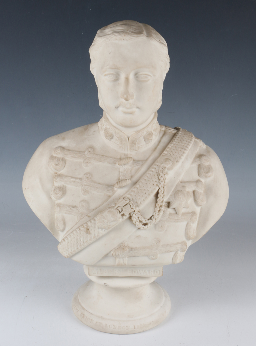 An Art Union of London Parian bust of Albert Edward, Prince of Wales, post 1864, modelled after Morton Edwards and Delpech, raised on a socle base, impressed marks to reverse, height 37cm (minor faults).