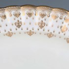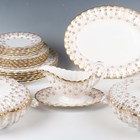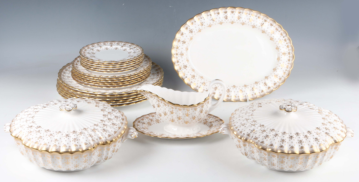 A Spode Gold Fleur De Lys pattern part service, comprising two tureens and covers, an oval platter, length 32cm, six dinner plates, diameter 27.3cm, six dessert plates, diameter 20.5cm, six tea plates, diameter 16.5cm, and a sauce boat and stand.