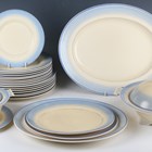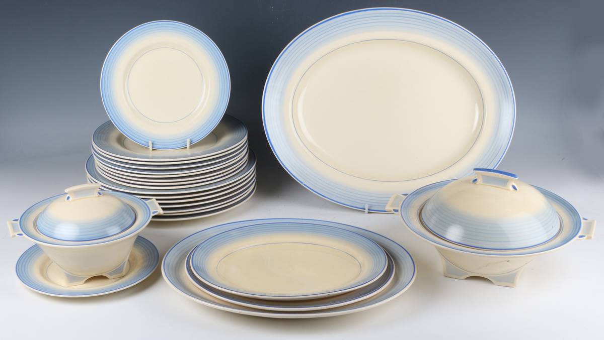 A Royal Doulton Art Deco pottery part service, with blue banded decoration to the rims, comprising vegetable tureen and cover, sauce tureen and cover, four graduated oval platters, longest 38.5cm, seven dinner plates, diameter 26.5cm, eight dessert plates, diameter 24cm, and two side plates, diameter 19.5cm, pattern No. D5407.
