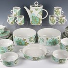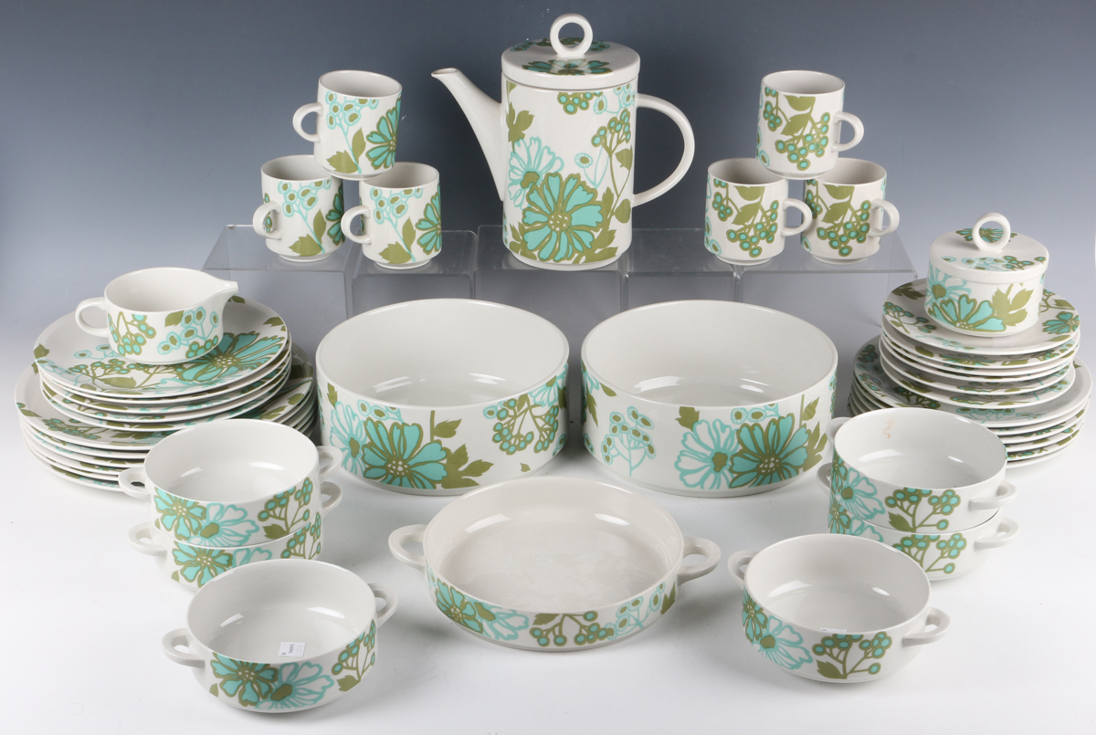 A Villeroy & Boch Scarlett pattern part service, designed by Christine Reuter, comprising two circular serving bowls, diameter 20.5cm, a two-handled shallow circular dish, diameter including handles 23.8cm, six two-handled soup bowls and stands, six dinner plates, diameter 24cm, five dessert plates, diameter 20cm, six coffee cups and saucers, coffee pot and cover, sugar bowl and cover and milk jug (plates scratched).