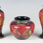 Three Moorcroft Pottery Pomegranate pattern small vases, circa 1915, each with shaded blue/green ground, two of baluster shape, 10cm and 10.3cm high, and one of bulbous shape, 6.3cm high, impressed and painted marks to bases (taller baluster vase with restoration to foot).