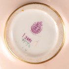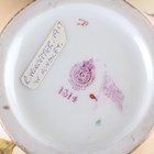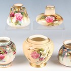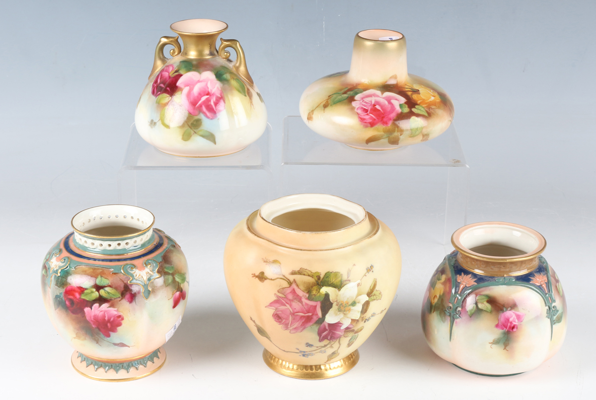 Five Royal Worcester vases painted with roses, including a bulbous example with gilt scroll handles, dated 1913, height 8.3cm, a blush ground example with moulded detail to the shoulders, dated 1903, height 8cm, and a similar example with pierced neck rim, dated 1907, height 9.8cm (minor faults).