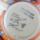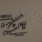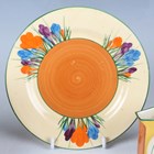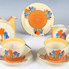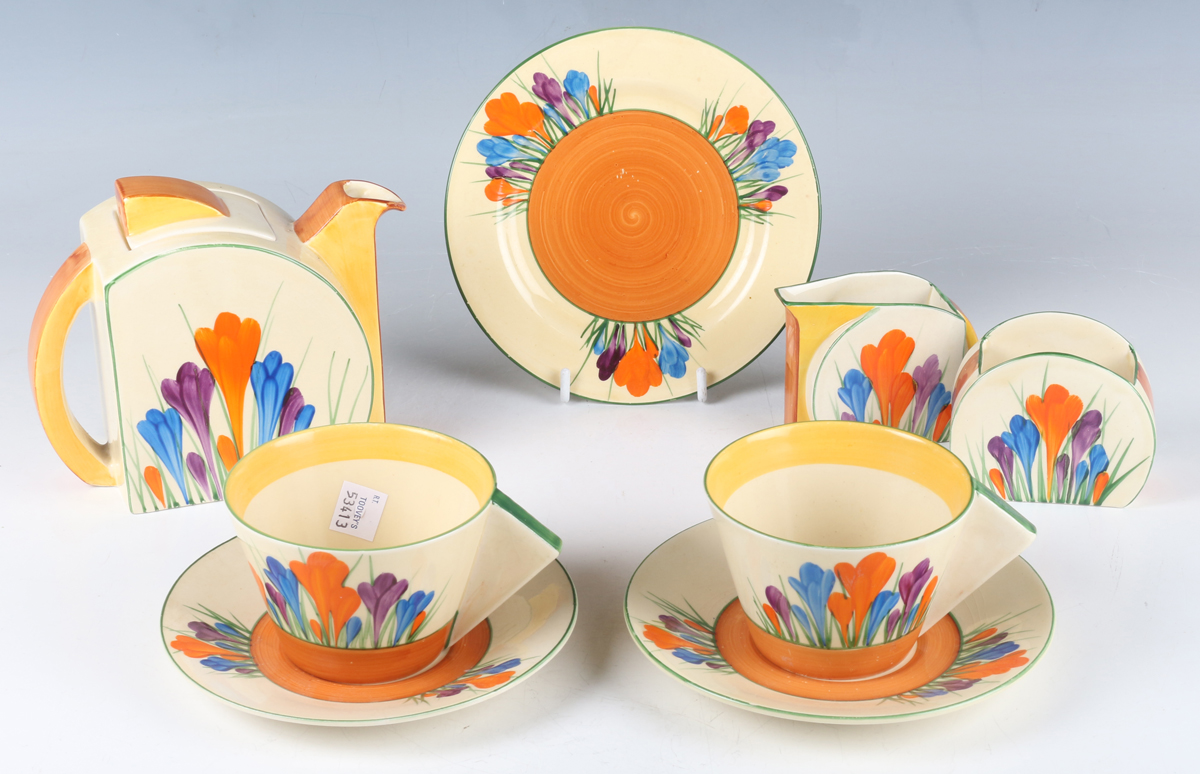 An Art Deco Clarice Cliff Bizarre Stamford shape Autumn Crocus pattern tea for two, 1930s, comprising teapot and cover, jug, sugar bowl, two cups and saucers and a tea plate, black printed, painted and impressed marks to bases, height of teapot 11.5cm, diameter of tea plate 15.3cm.