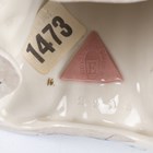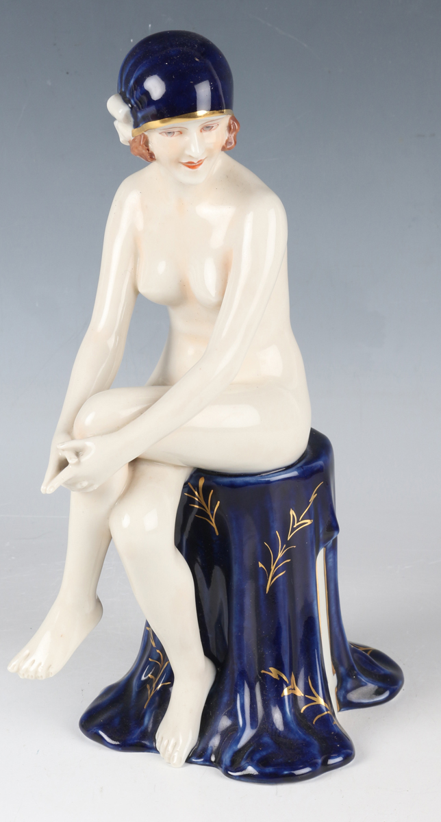 A Royal Dux model of a female nude, 1900-18, wearing a blue hat, seated on a cylindrical base draped in a gilt decorated blue cloth, impressed numerals to base '2998' and applied pink triangle, height 27cm.