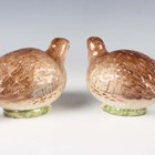 A pair of Meissen models of quail, late 19th/early 20th century, naturalistically coloured on small green glazed mound bases, crossed swords in underglaze blue to bases and incised model Nos. 478, both 13cm long (each beak restored).
