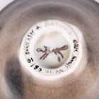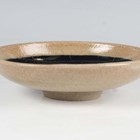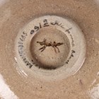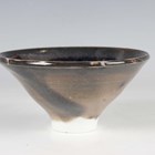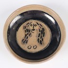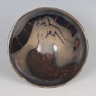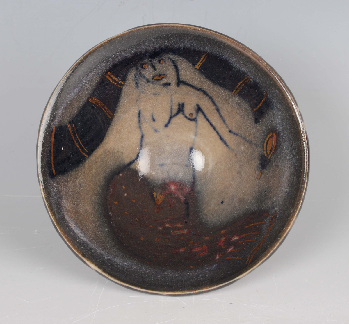 An Eric James Mellon studio pottery flared conical bowl, painted and gilt to the interior with a mermaid, bean ash glaze, inscribed marks to footrim, diameter 11.3cm, together with an Eric James Mellon studio pottery small circular dish, titled Moon Goddess, painted and gilt with a half length nude within a dark circular frame, elm ash glaze, inscribed marks to footrim interior, diameter 10.5cm.