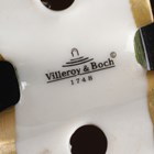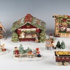 A small group of Villeroy & Boch Nostalgic Christmas Market ornaments, comprising three buildings with pierced roofs and bases, two hanging tree decorations, a seated model of Father Christmas and three figural groups on snowy bases, tallest building is the gingerbread house, 18cm high, each boxed.