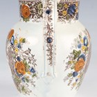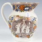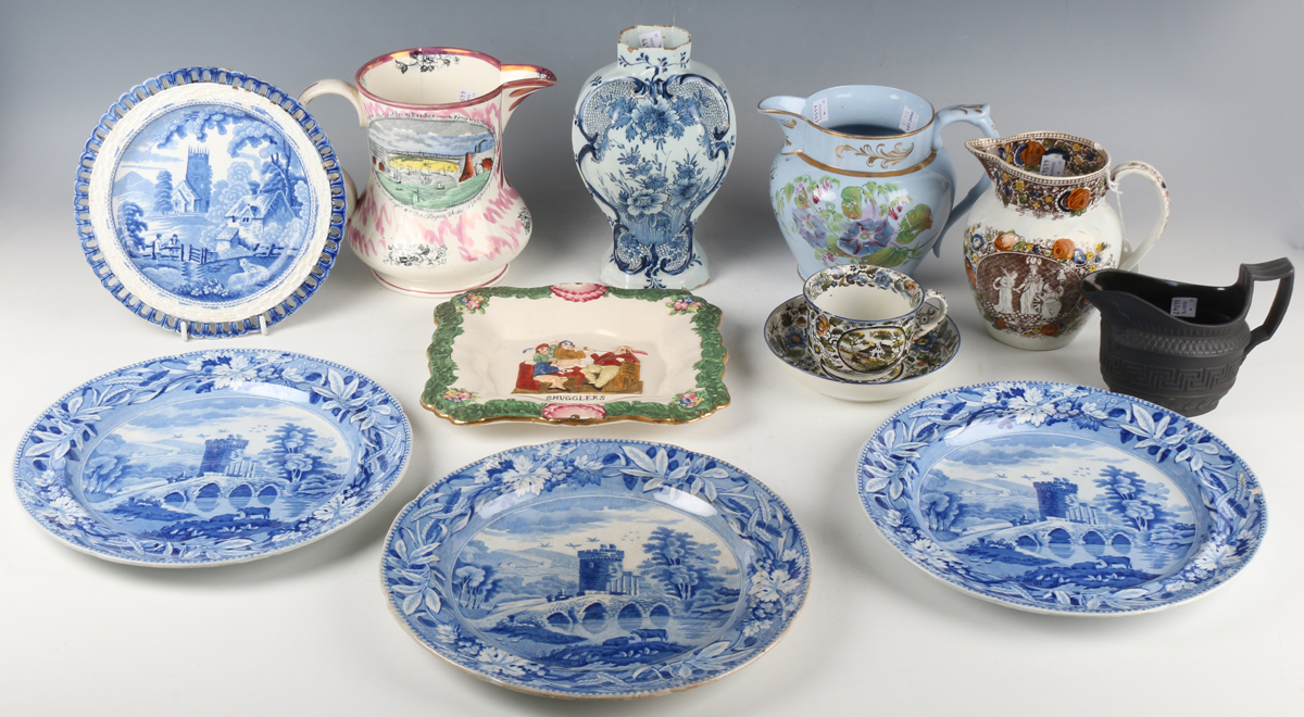 A Peace of Amiens pearlware commemorative jug, circa 1802, probably Wedgwood & Co (Ferrybridge), printed in brown with opposing oval emblems depicting figures representing Britain, France and Peace within coloured floral surrounds, height 13.5cm, together with a mixed group of British pottery, mostly 19th century, including a Sunderland lustre jug printed with 'A West View of the Cast Iron Bridge...' opposing verse, height 15.3cm, a floral painted blue pottery jug dated 1850, a pearlware cup and saucer, probably Salopian, a basalt jug and three blue printed plates, together with a Dutch Delft vase, height 18.3cm (faults).