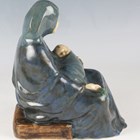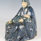 A rare Hammersmith pottery figure The Madonna of the Square (The Lavender Woman), dated 1913, modelled by Pheobe Stabler, as a seated woman holding a baby on her lap, a sprig of lavender in her right hand, incised 'PHOEBE STABLER 1913' to side edge of base and 'STABLER No.32 1912 HAMMERSMITH' to interior side, height 20cm. Note: this figure was designed by Stabler after the early 20th century Chelsea street vendors. It was later produced in a number of colourways by Royal Doulton. This particular example is rare due to the fact it does not have a basket of flowers at the feet of the figure. By repute, the current vendors family knew Stabler and asked her to model this particular example without the basket, it is therefore possibly a unique piece. There is a typed note glued to the interior of the figure explaining this.