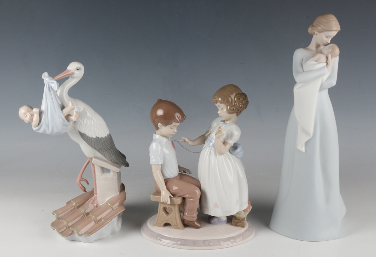 Three Lladro figures, comprising With All My Heart, No. 6906, Special Gift, No. 6228, and a matt bisque figure A Mother's Embrace, No. 8218, with some paperwork.