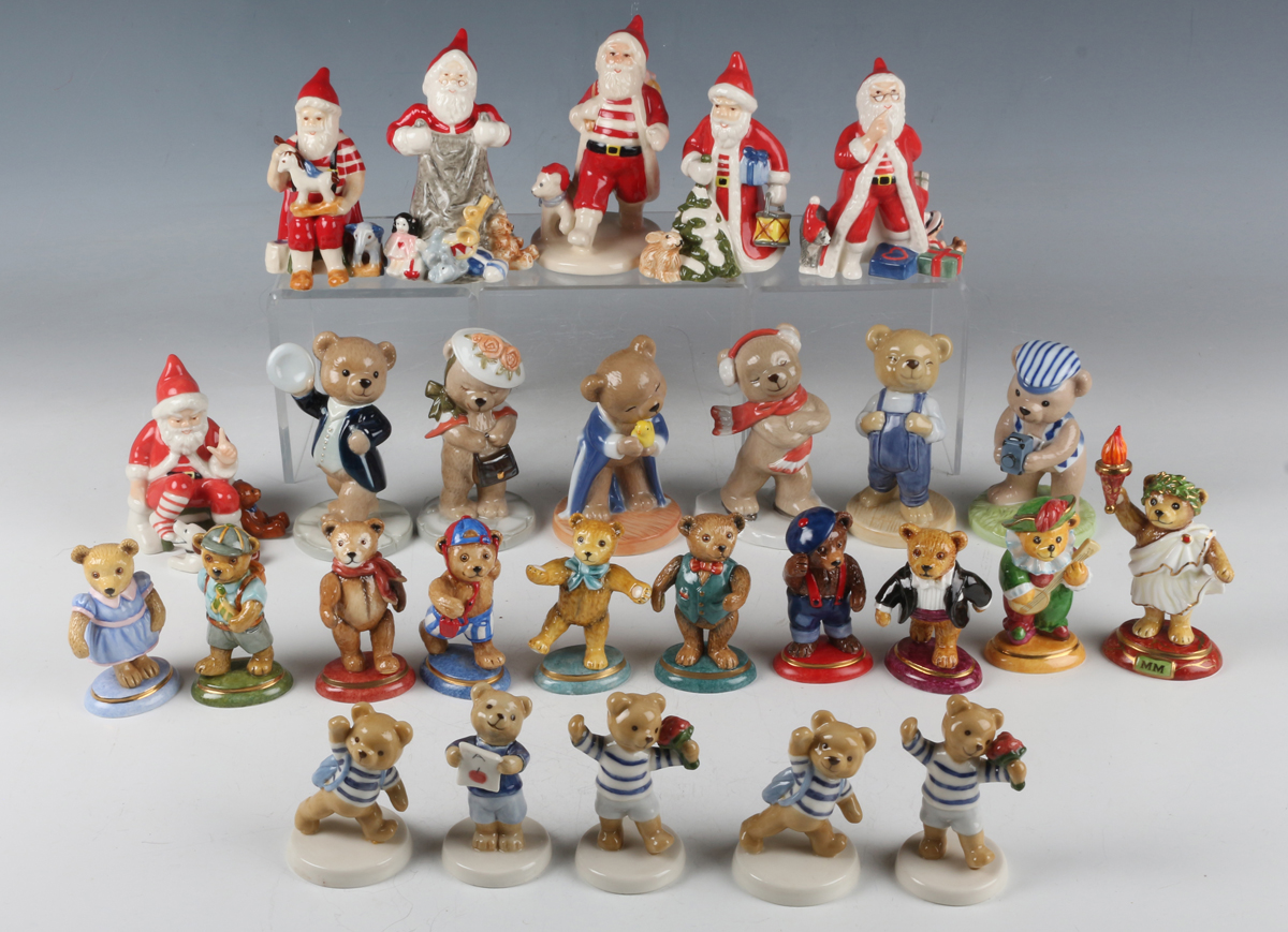 Six Royal Copenhagen limited edition small Annual Santa figures, from the years 2012, 2015, 2016, 2018, 2019 and 2020, tallest 11cm, together with six Bing & Grondahl Victor and Victoria Teddy Bear Collection figures, five smaller Bing & Grondahl Victor and Victoria's Family Teddy Bear figures and ten Halcyon Days teddy bear figures.