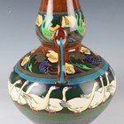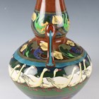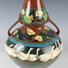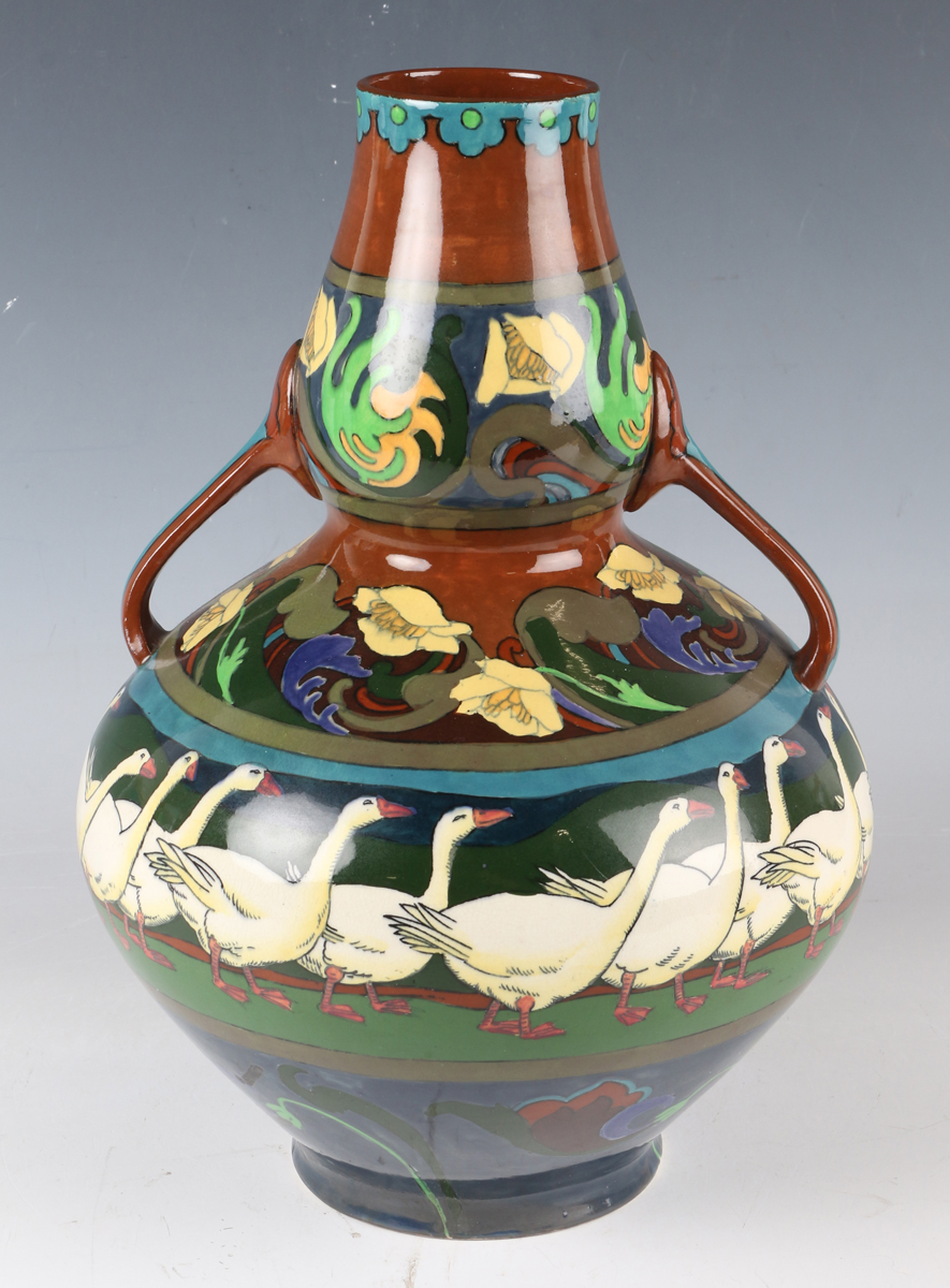 A Wileman & Co Foley Intarsio two handled vase of bulbous shape with pear shaped neck, designed by Frederick Rhead, with a band of geese between stylized foliate banding against a brown ground, black printed factory marks to base with numerals '3084', height 30cm.
