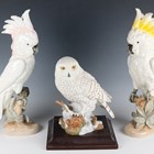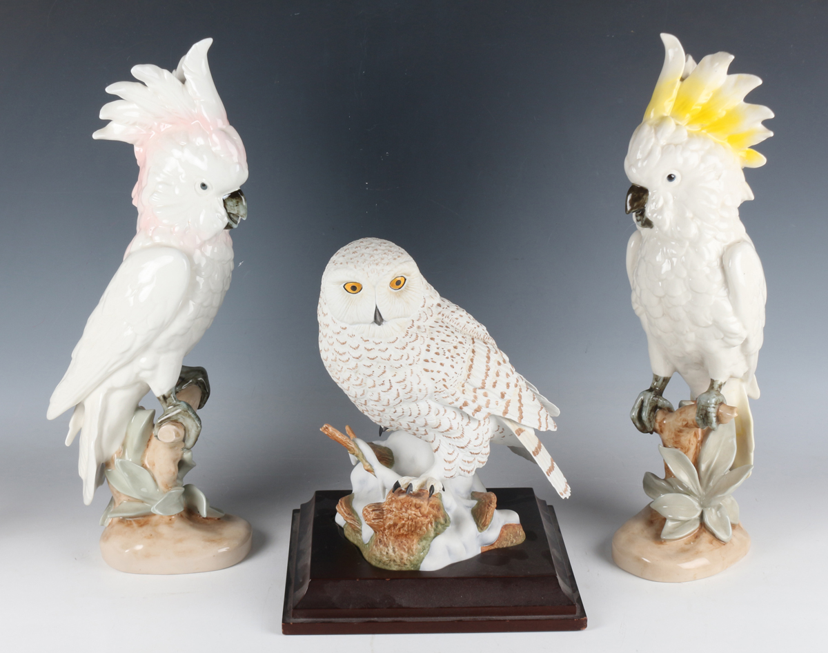 Two Royal Dux models of cockatoos, 20th century, one with yellow tinged plumage, the other pink, both perched on a leafy branch and oval base, applied pink triangle marks to bases with other printed and impressed marks, model No. 402, height 41cm, together with a Kaiser limited edition model of a Snowy Owl, No. 118 of 3000, with wood base, height 28cm.
