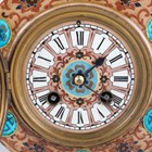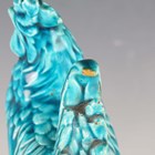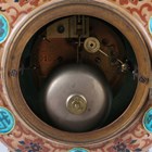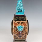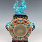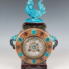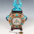 A French Aesthetic period majolica pottery cased mantel clock, probably by Jules Vieillard (Bordeaux), late 19th century, with eight day movement striking on a bell marked 'MAPLE & Co PARIS', the circular dial with black Roman numerals against a ground painted in shades of brown and turquoise, the circular case with turquoise glazed cockerel surmount, the body painted with flowers and stylized scrolling foliage in shades of brown around turquoise ground Mon, flanked by mask and tongue handles and raised on an integral hardwood style base, impressed numerals to base 726, height 32cm, with pendulum and key (minor faults).
