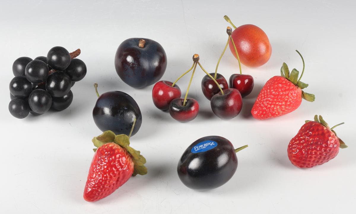 A small group of Penkridge Ceramics realistic pottery fruit, comprising a bunch of black grapes, five cherries and four plums, one plum with applied paper label, together with three similar strawberries. Note: the current vendor had the grapes made by special request to the pottery.