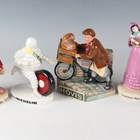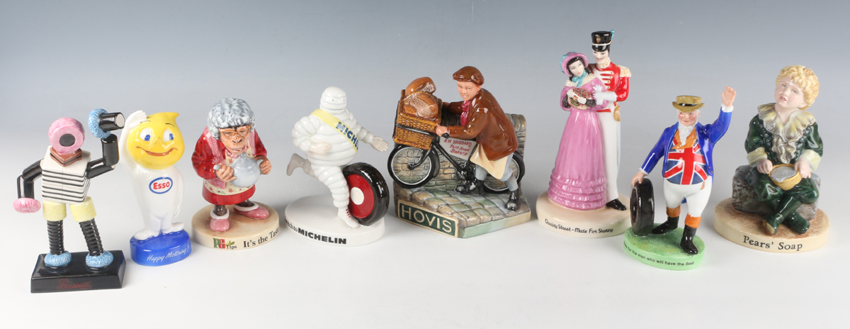 Seven Royal Doulton Millennium Collectables limited edition 20th century advertising figures, comprising Bibendum - Michelin Man, No. 862 of 2000, Esso Oil Drop Man, No. 340 of 750, PG Tips Chimp - Ada, No. 180 of 750, John Bull Tyre Man, No. 218 of 750, Pears Bubbles, No. 168 of 750, The Hovis Boy, No. 367 of 600 and the Quality Street Couple, No. 213 of 950, together with a Coalport Millennium Collectables limited edition figure Bertie Bassett, No. 542 of 1500, each boxed with certificate.
