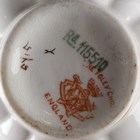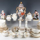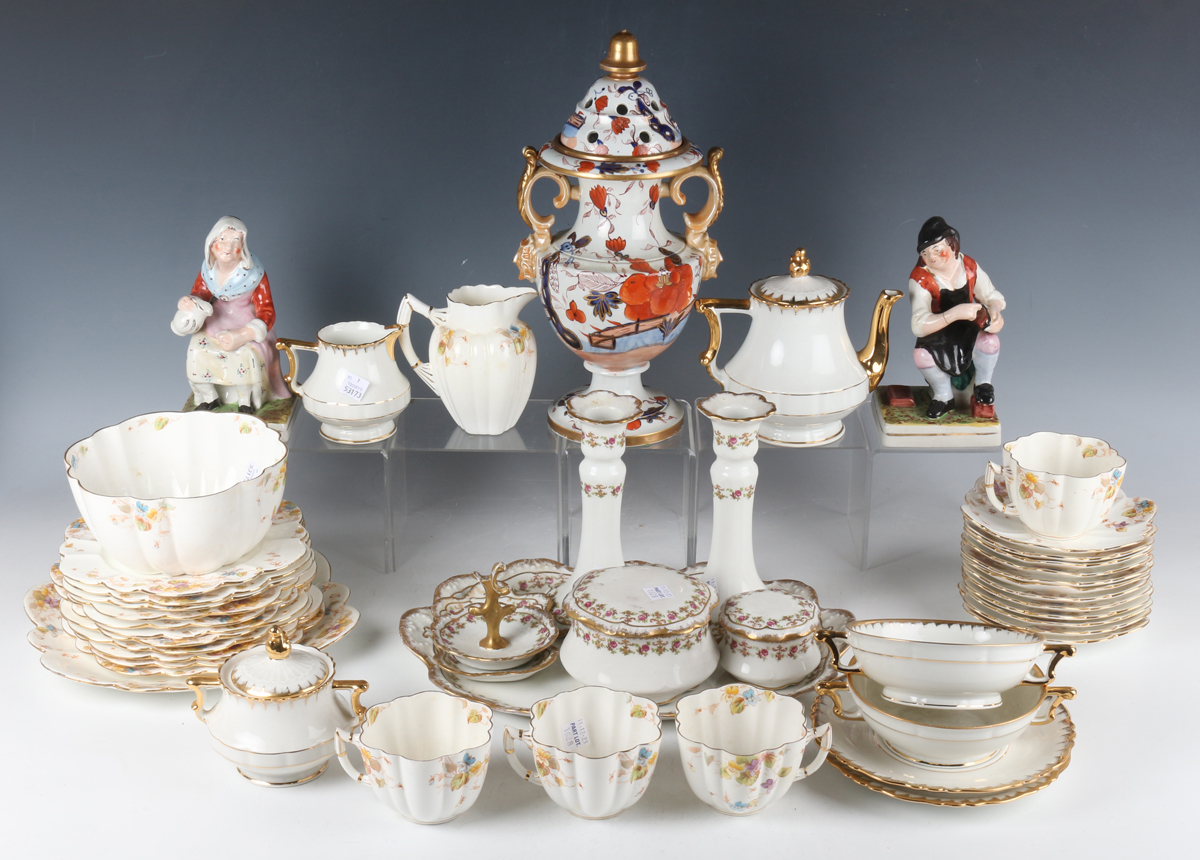 An English ironstone two-handled potpourri vase and cover, probably Masons, painted and gilt in a Japan Fence pattern, the scroll handles with mask terminals, the pierced cover of domed shape, unmarked, height 31cm, together with a Wileman & Co Foley porcelain part tea service decorated with viola flowers, a Limoges dressing table set, a Limoges tea for two and a pair of Staffordshire pottery figures the Cobbler and his Wife (faults).