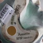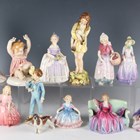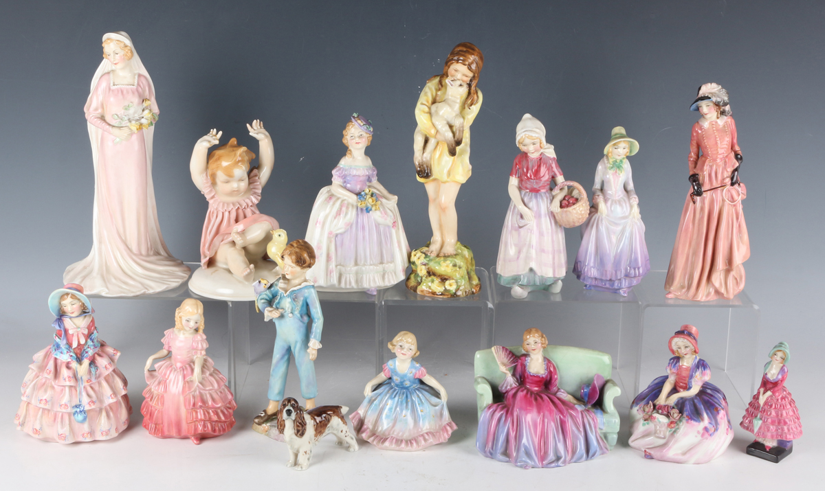 Eleven Royal Doulton figures, comprising Annette, HN1550, Hazel, HN1797, The Bride, HN1600, Maureen, HN1770, Daisy, HN1575, Sweet and Twenty, HN1589, Rose, HN1368, Monica, HN1467, Priscilla, M24, Dainty May, HN1656, and Marigold, HN1447, together with two Royal Worcester Doughty figures, a Doulton dog and a Karl Ens figure of a girl toddler with a chick (some faults and repairs).