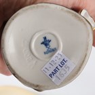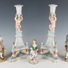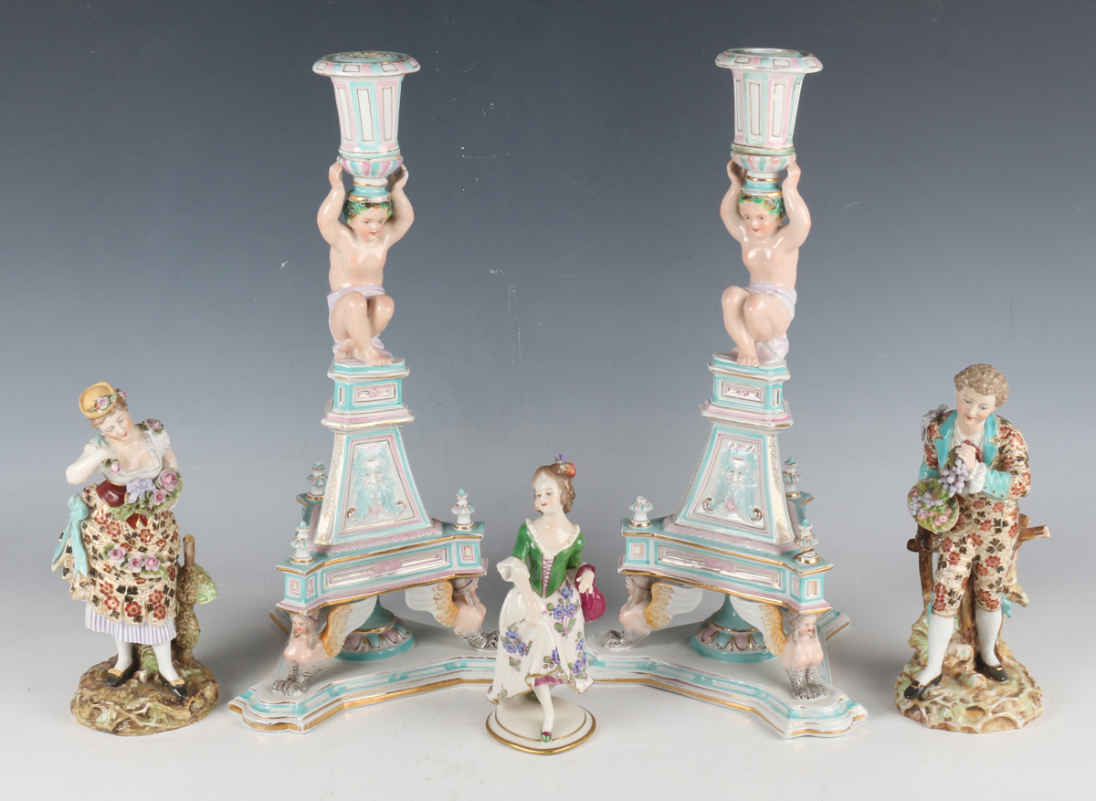 A pair of Continental porcelain candlesticks, circa 1900, modelled with seated putti supporting sconces on their heads, raised on triangular bases painted in blue and turquoise enamels with gilt details, moulded with masks and raised on winged female busts with claw feet above the triform bases, underglaze blue and incised marks to bases, height 34cm, together with a pair of Rudolstadt Volkstedt figures, height 19cm, and another Continental figure (some faults and repairs).