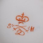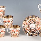 A Stevenson & Hancock Derby porcelain Japan pattern part coffee service, early 20th century, comprising six coffee cups and saucers, cream jug and sugar bowl, red painted marks to bases, diameter of saucers 11cm (one cup cracked).