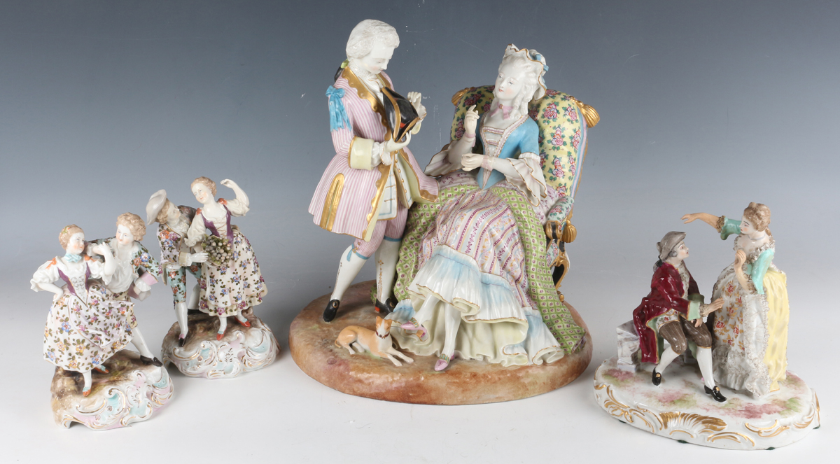 A large Paris porcelain Meissen style figure group, late 19th century, modelled as a lady seated in an armchair, a dog resting at her feet and a gallant companion standing next to her, on a shaped oval base, underglaze blue factory mark, height 31cm, together with a pair of Rudolstadt Volkstedt figures, height 18cm, and another Continental figure group of a lady and gentleman, height 20cm (some faults and restoration).