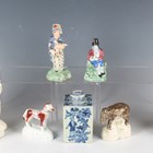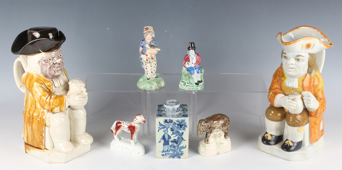 A pearlware ordinary Pratt type Toby jug, early 19th century, seated holding a jug of foaming ale, with ochre coloured frock coat, height 24cm, a similar 19th century Toby jug and cover, an English porcelain model of a dog standing on an oval base, with liver markings and spots, height 8cm, a Staffordshire pottery model of an elephant, circa 1860, height 7.5cm, two small early 19th century Staffordshire pottery figures and an early 20th century Delft square shaped caddy and cover, height 10.5cm (faults and restoration).