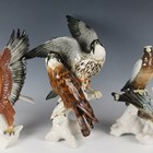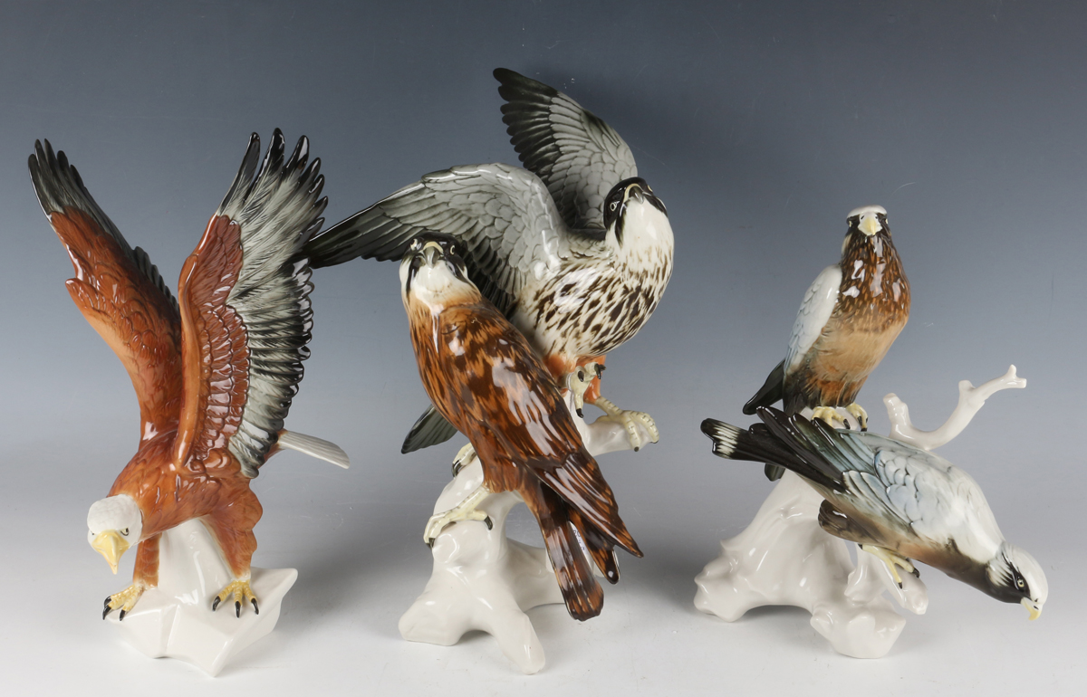 Three Karl Ens bird of prey models, comprising a bald eagle with open wings, height 31cm, two hen harriers with closed wings on a branch base, height 27cm, and two peregrine falcons on a branch base, height 29cm.
