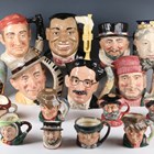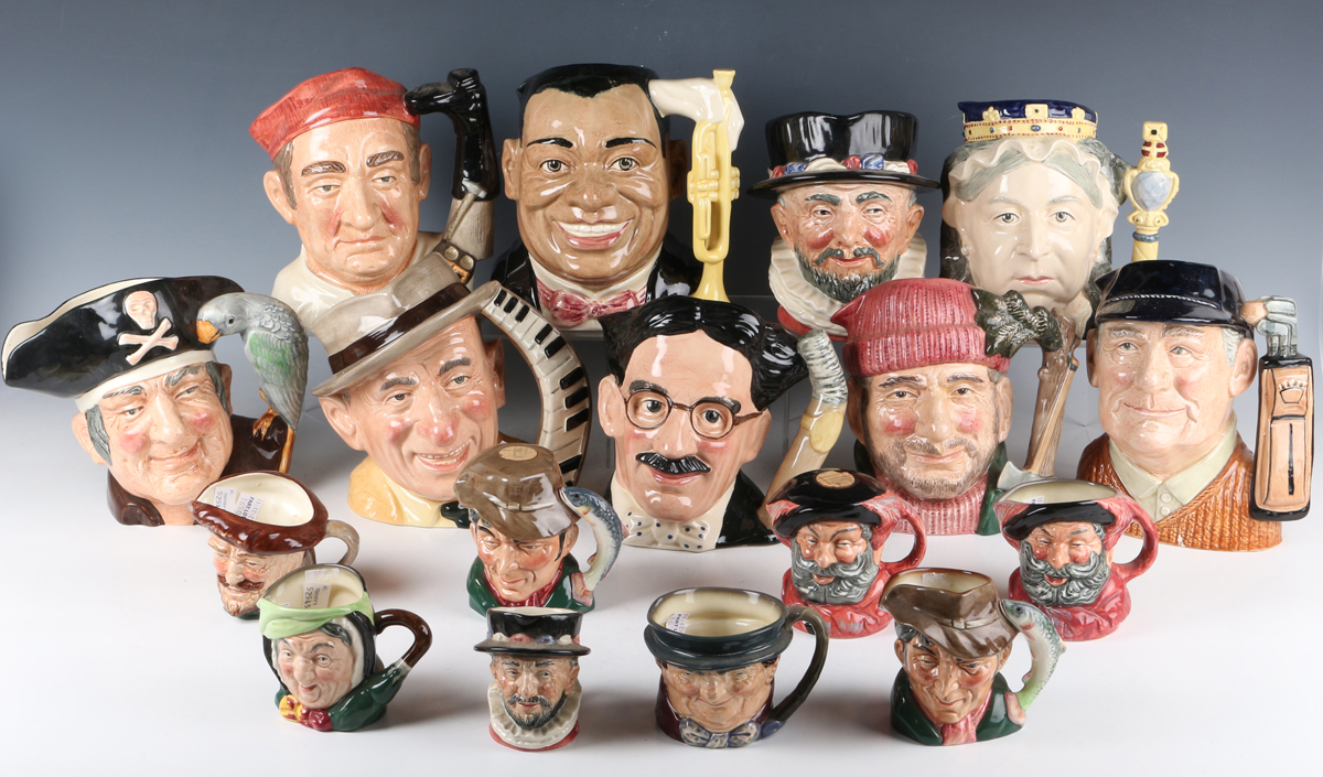 Nine large Royal Doulton character jugs, comprising Groucho Marx, Bootmaker, Louis Armstrong, Long John Silver, Jimmy Durante, Beefeater, special edition Queen Victoria, Lumberjack and Golfer, together with six small Royal Doulton character jugs and two Royal Doulton liquor character containers.