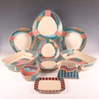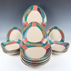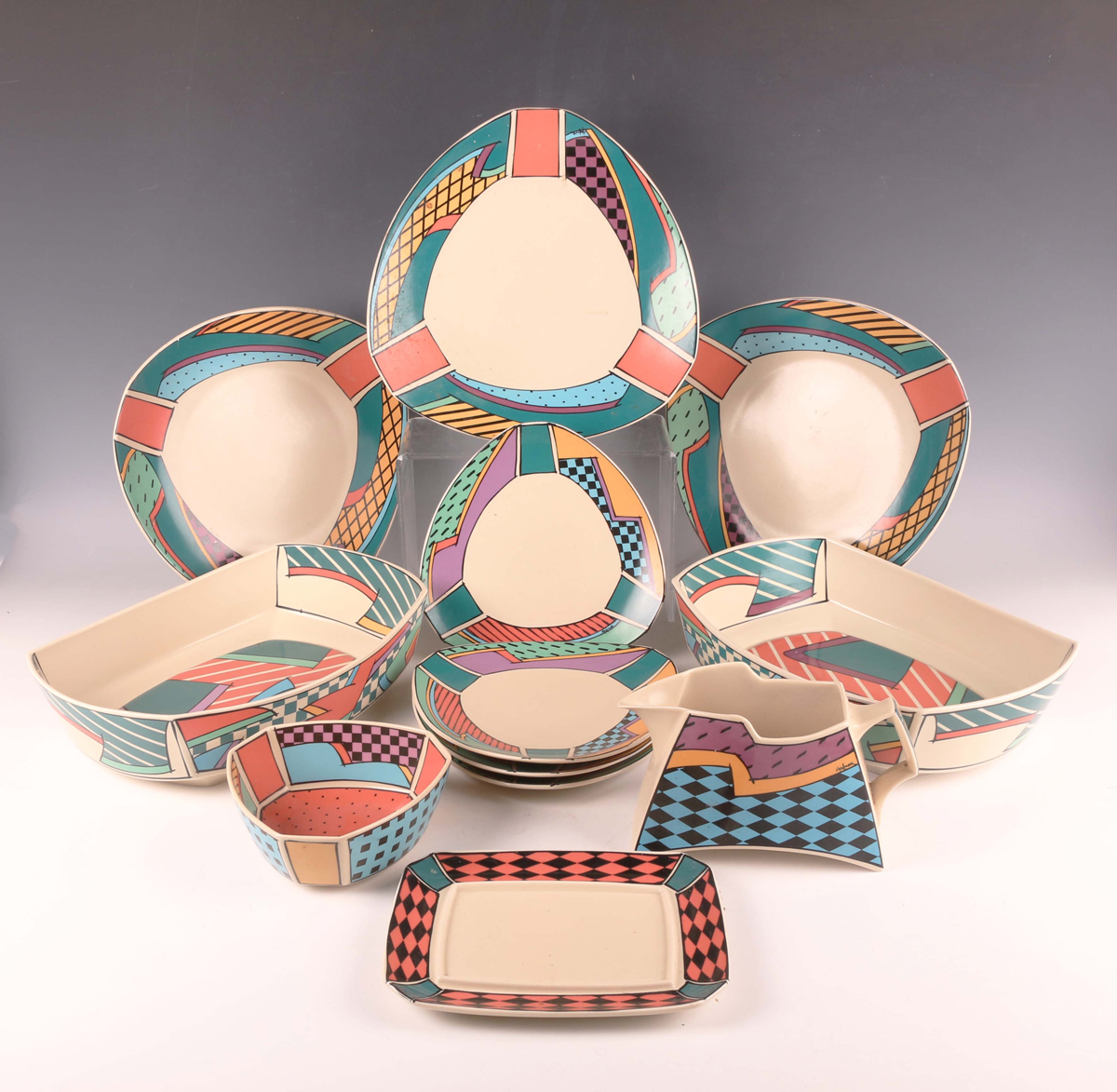 A group of Rosenthal Studio-Linie Flash pattern tablewares, late 20th century, designed by Dorothy Hafner, comprising twelve dinner plates, nine dessert bowls, two rectangular serving dishes, a sauceboat, four tea plates, a rectangular butter dish base and a cereal bowl, various printed and impressed marks to bases.