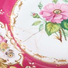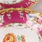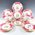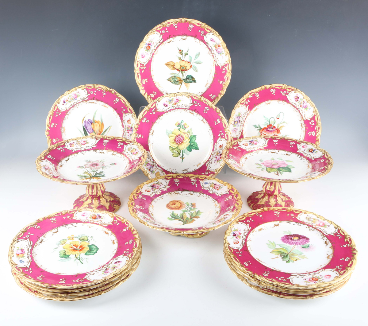 A Coalport porcelain part dessert service, circa 1840, painted in the manner of Stephen Lawrance, with botanical studies within puce borders reserved with floral panels beneath gilt edged scroll moulded rims, comprising twelve plates, diameter 24cm, two tazzas and a low stand (faults and repairs to tazzas and stand).
