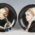 Two small porcelain plates, Eastern European, possibly Russian (Baranowka), circa 1900, printed and painted with head and shoulder busts of elegant ladies in period dress, impressed mark to one,13.3cm and 14cm diameter.