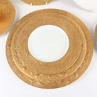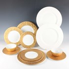 A small group of Rosenthal Zauberflöte (Magic Flute) Sarastro dinnerwares, designed by Bjørn Wiinblad, with moulded gilt decoration after Mozart's opera The Magic Flute, comprising two circular dishes and stands, two plates 19cm diameter, two plates 22.3cm diameter, two plates 26.5cm diameter and two plates in the white 28.8cm diameter, gilt printed and painted marks to bases.