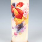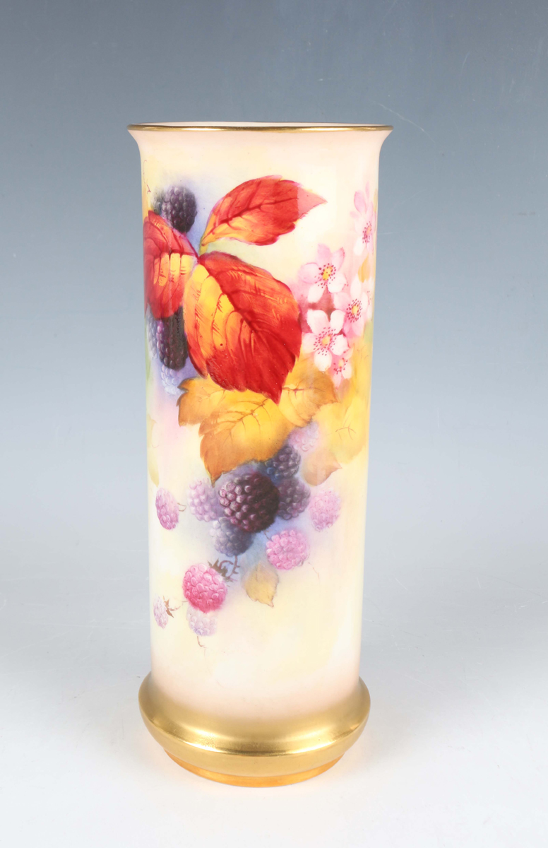 A Royal Worcester cylindrical vase, dated 1934, painted by K. Blake, signed, with autumnal berries, leaves and blossom between a gilt rim and foot, puce printed marks to base, height 23cm.