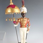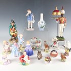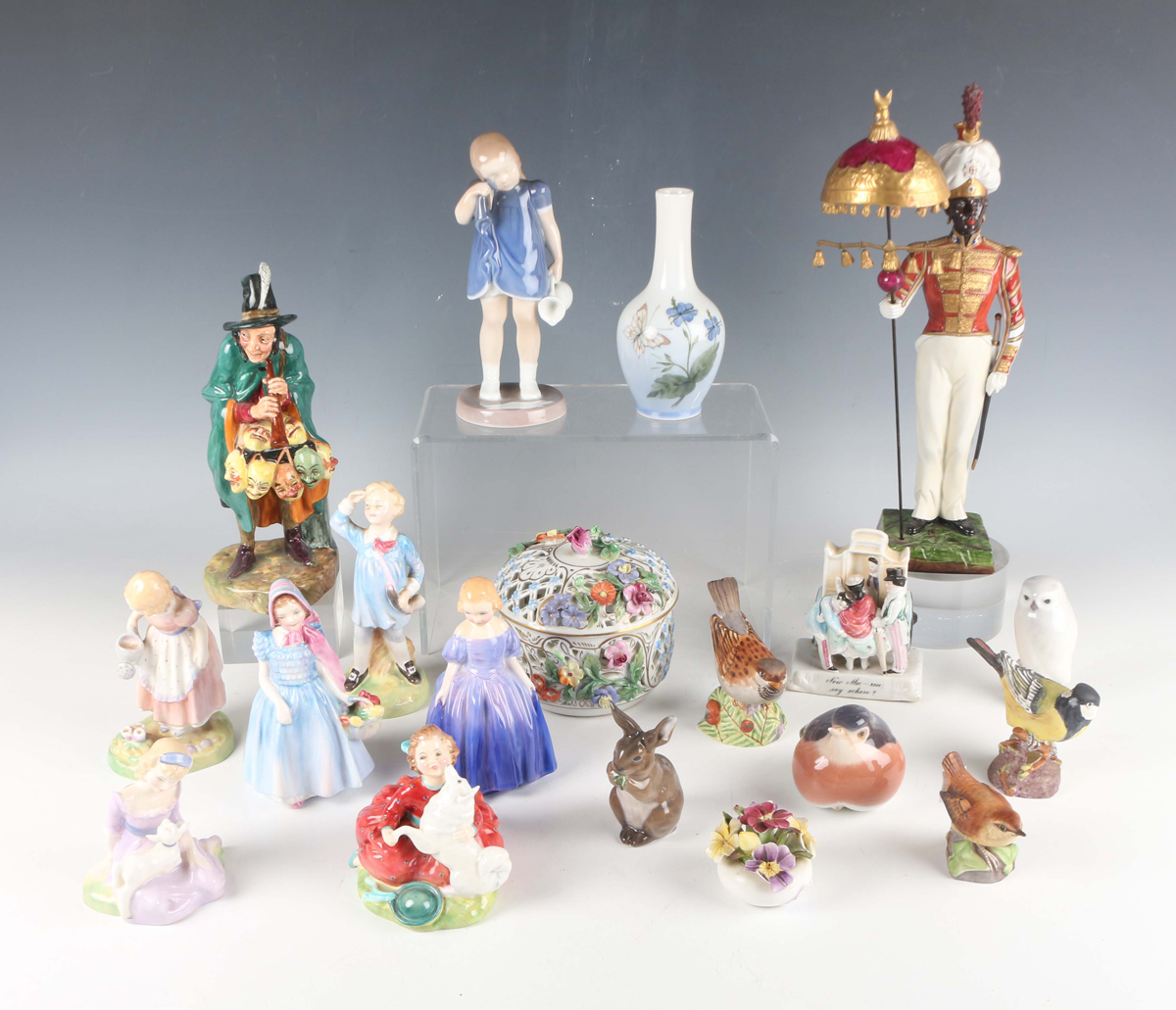 Seven Royal Doulton figures, comprising The Mask Seller, HN2103, Little Boy Blue, HN2062, Mary Mary, HN2044, Mary Had a Little Lamb, HN2048, Wendy, HN2109, Home Again, HN2167, and Marie, HN1370, together with a Continental porcelain model of a military figure titled to the base Coldstream Guards, height 32cm, three Royal Worcester bisque porcelain small bird models, five pieces of Copenhagen porcelain, a Dresden pierced circular pot and cover encrusted with flowers and two other pieces (minor faults and repairs).
