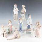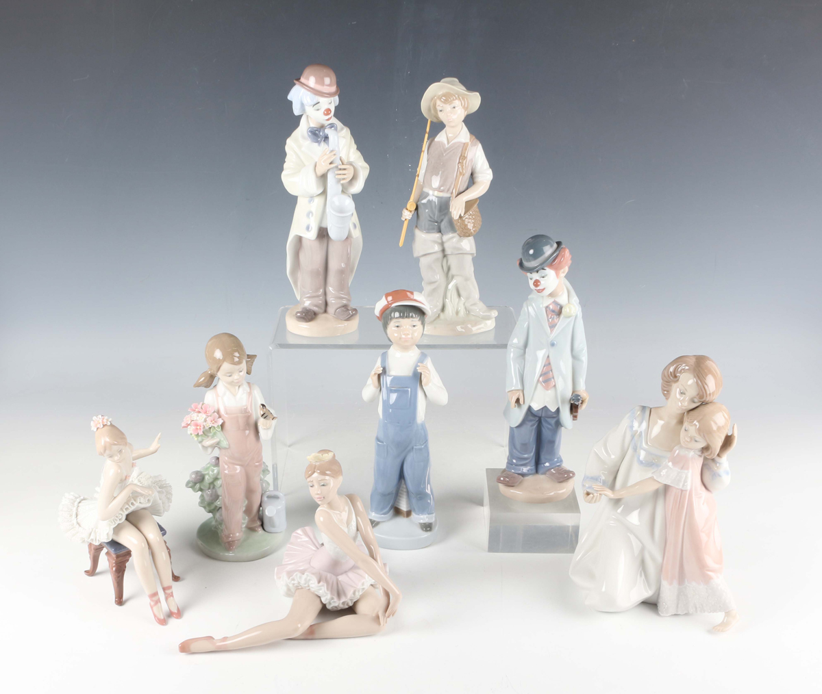 Eight Lladro figures, comprising Boy From Madrid, No. 4898, Sad Sax Clown, No. 5471, Good Night, No. 5449, Graceful Pose, No. 6174, Spring, No. 5217, Circus Sam Clown, No. 5472, Recital, No. 5496, and Fisher Boy, No. 4809.