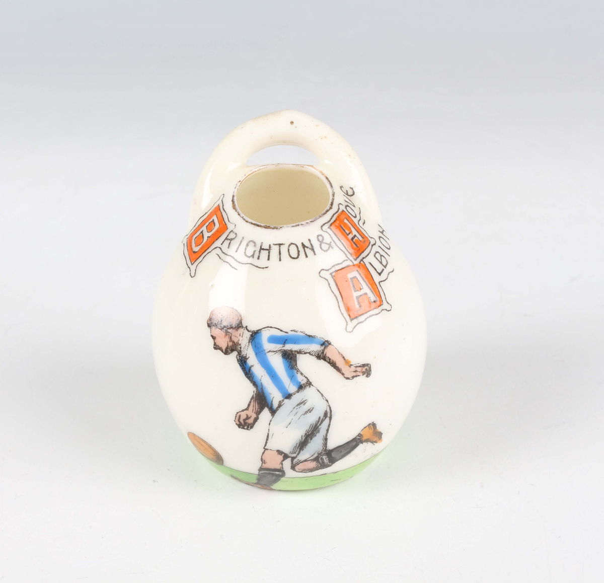 A rare Gray's Sports China crested miniature, circa 1911, decorated with a running footballer below the title Brighton & Hove Albion, opposing a panel to the reverse inscribed 'CHAMPIONS SOUTHERN LEAGUE 1909-10', black printed registered number to base '588114', height 6cm.