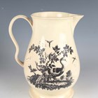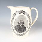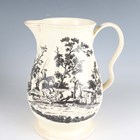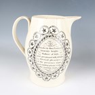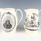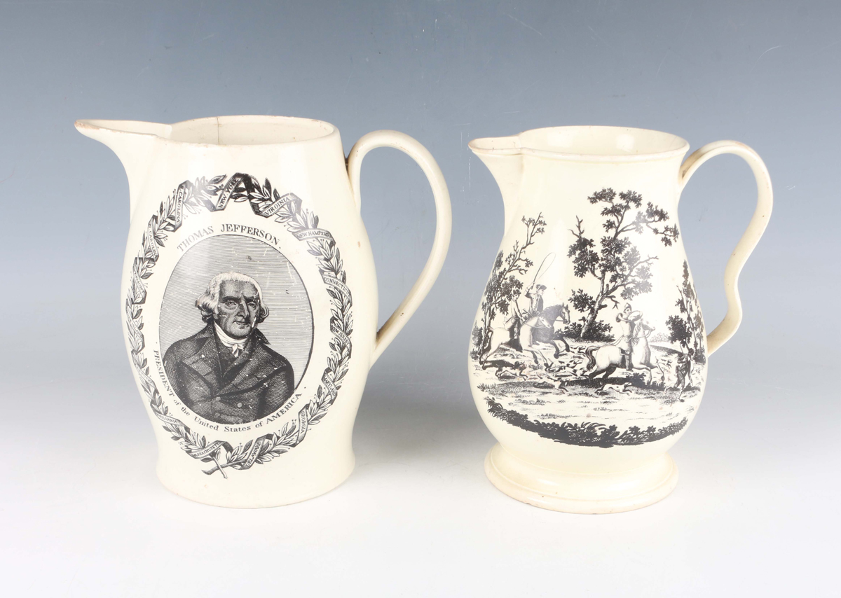 A rare political subject commemorative creamware jug, probably Liverpool Herculaneum, circa 1800, printed in black to one side with a head and shoulders portrait of a seated gentleman titled 'THOMAS JEFFERSON PRESIDENT of the United States of AMERICA', within a laurel wreath entwined with a ribbon inscribed with the names of the first fifteen states of America, to the reverse a section of verse within a frame of fifteen stars and entwined ribbons also inscribed with the names of the first fifteen states of America, detailed F. Morris Shelton within the frame of the verse, otherwise unmarked, height 20cm (faults), together with another creamware jug, printed in black with a hunt to one side and exotic birds to the other, height 19cm (faults). Note: the portrait on the first jug would seem to depict James Madison rather than Thomas Jefferson. The section of verse is taken from the British writer and politician Joseph Addison's poem Immortality.
