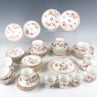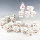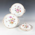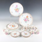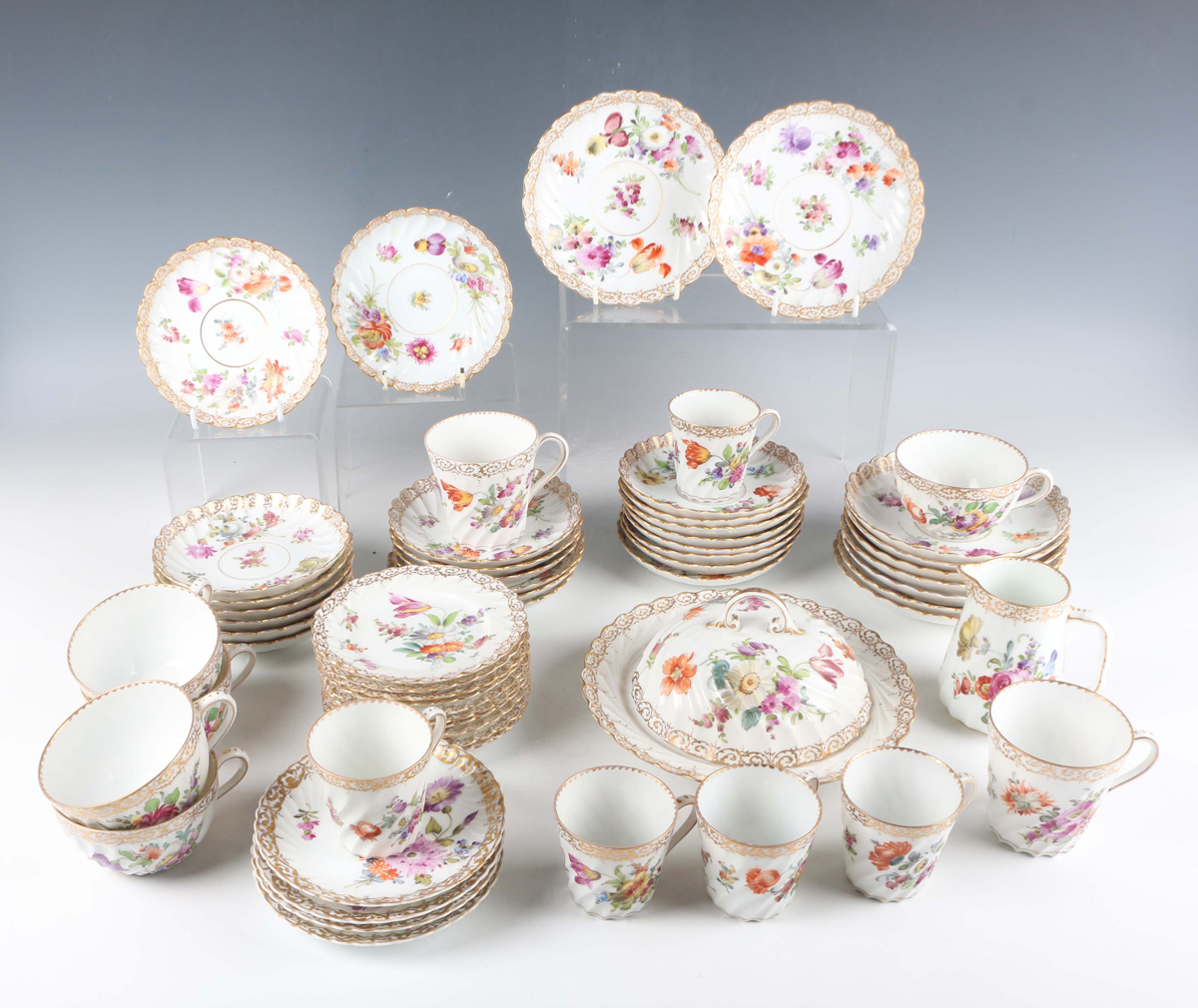 A mixed group of Dresden porcelain tablewares, first half 20th century, of wrythen moulded form painted with floral sprays and scattered sprigs beneath gilt scroll rims, comprising a graduated pair of muffin dishes and covers, a pair of two-handled plates, ten teacups, seven large coffee cups, eighteen small coffee cups, nine large saucers, sixteen small saucers, twenty assorted small plates, milk jug, sugar bowl and a small baluster shaped vase and cover, height 13cm, together with a small matched group of Nymphenburg tablewares (faults and repairs).