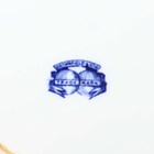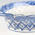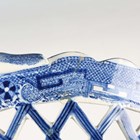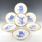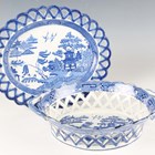 A Brownfield Aesthetic porcelain part dessert service, 1880s, each piece printed in blue with a different animal within raised gilt rims, comprising five plates, diameter 23.2cm, and two low stands, impressed and blue printed marks to bases, together with a pearlware blue printed oval shaped basket and stand, early 19th century, with pierced trellis work sides and a Willow type pattern, length of stand 26cm (faults).