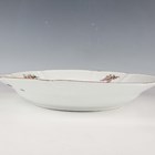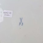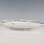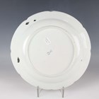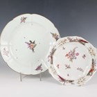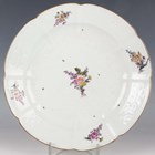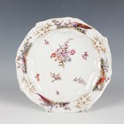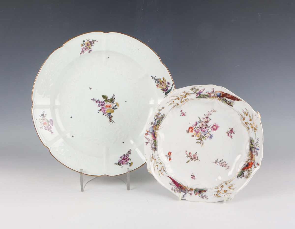 A Meissen porcelain circular dish, mid 18th century, painted with bouquets of deutsche Blumen within raised foliate moulded detail, the rim gilt, crossed swords mark in underglaze blue to base, diameter 28.3cm, together with a Gold Anchor period Chelsea porcelain plate, painted with floral bouquets and sprigs within a gilt enriched scroll moulded rim painted with birds, gold painted anchor mark to base, diameter 22.5cm (faults).