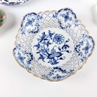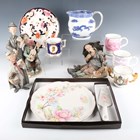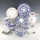 A Meissen Onion pattern underglaze blue decorated pierced circular dish, early 20th century, with gilt rim, underglaze blue crossed swords mark to base, diameter 18cm, together with a Dresden Helena Wolfsohn type lobed teacup and saucer, a Royal Crown Derby limited edition loving cup commemorating the 80th Birthday of H.M. Queen Elizabeth The Queen Mother, No. 397 of 500, height 7.5cm, three other limited edition commemoratives, a Coalport Caughley Mask-Head Jug, height 19cm, a small group of other 20th century ceramics and three Capodimonte tramp subject ornaments (some faults).