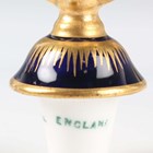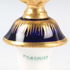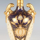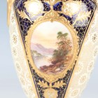 A Coalport porcelain cobalt blue ground two-handled vase and cover, early 20th century, painted with a view of a loch within a raised gilt frame against a gilt cracked ice ground flanked by two gilt flowerhead panels, the gilt scroll handles with moulded wreath detail, the cover with pointed gilt knop, green printed and gilt painted marks to base, height 22.5cm (chip to knop of cover).