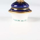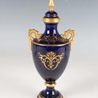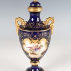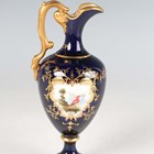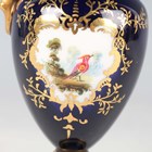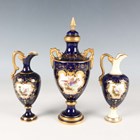A small Coalport porcelain ewer, early 20th century, painted by Waterson, signed, with an exotic bird within a gilt frame against a cobalt blue ground, the gilt handle of scroll moulded shape, green printed and gilt painted marks to base, height 12.5cm, together with a similar ewer with cream glazed neck and foot, height 12cm, and a Coalport two-handled vase and cover painted with an exotic bird panel against a cobalt blue ground, height 18cm (some restoration).