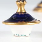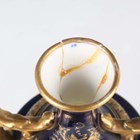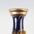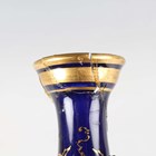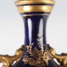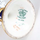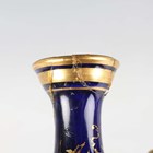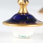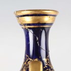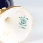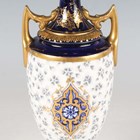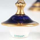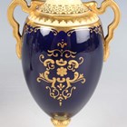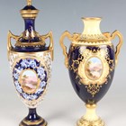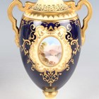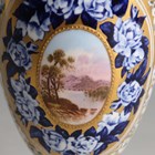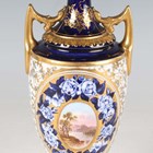 A Coalport porcelain two-handled vase, early 20th century, painted with an oval panel of a mountainous waterside view within a cream and gilt frame against a cobalt blue ground detailed with further foliate gilt scrollwork, cream glazed neck and foot, flanked by gilt angular handles, green printed and gilt painted marks to base, height 15.5cm, together with a Coalport two-handled vase and cover, early 20th century, painted with an oval landscape panel within a frame of blue printed roses against a printed flowerhead ground, height 18cm (neck repaired).