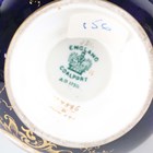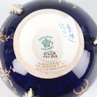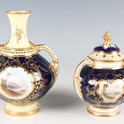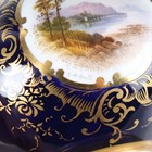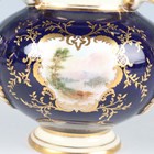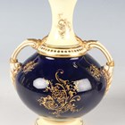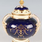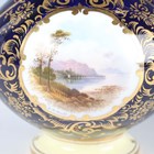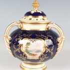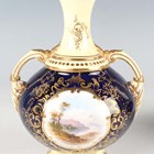A Coalport porcelain two-handled vase, early 20th century, painted by E.O. Ball, signed, with a circular landscape panel within a gilt frame against a cobalt blue ground, flanked by cream glazed gilt enriched handles with foliate terminals between the cream glazed neck and foot, green printed and gilt painted marks to base, height 12cm, together with a diminutive Coalport three handled potpourri vase and pierced cover, painted with a landscape panel within a gilt frame against a cobalt blue ground, height 9cm (knop restored).