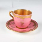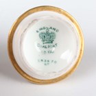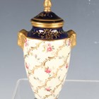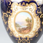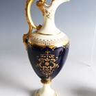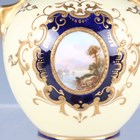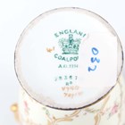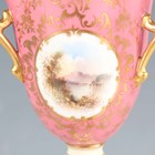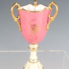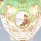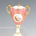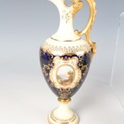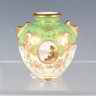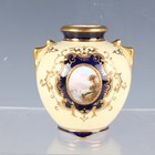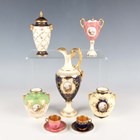 A small group of Coalport porcelain, early 20th century, comprising a blue and cream glazed ewer painted with an oval landscape panel, height 18.5cm, a pink ground three-handled tyg raised on a cream glazed stem foot, painted with an oval landscape panel, height 10.5cm, two squat bulbous vases, one with green glazed ground, the other cream glazed, both painted with a landscape panel, each 7.5cm high, a vase and cover with a pink rosebud and gilt trellis design against a cream ground, height 12cm, and two miniature gilt lined cups and saucers, one pink glazed, the other cobalt blue (some faults and restoration).