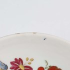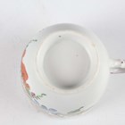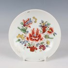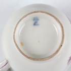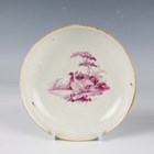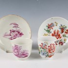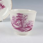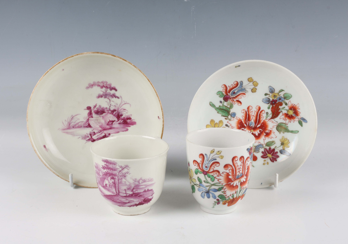 A Zurich porcelain teacup and matched saucer, circa 1775, painted in puce camaieu, the cup with a view of a figure walking through a village, height 6cm, the saucer with two ducks on the water's edge, diameter 14cm, underglaze blue 'Z' mark to bases, together with a Doccia coffee cup and saucer, late 18th century, polychrome painted with a Tulippino pattern, unmarked, diameter of saucer 13cm (minor faults).