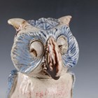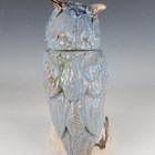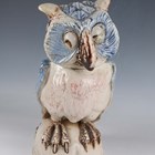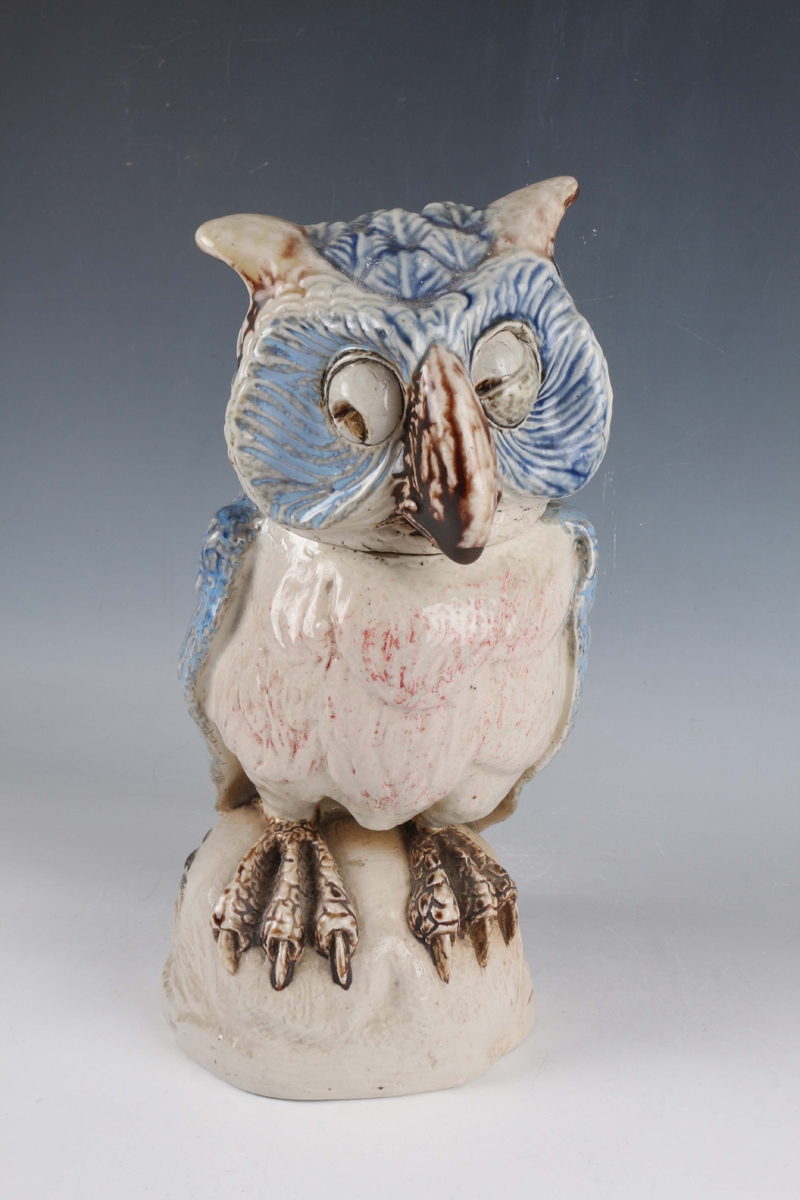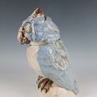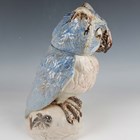 A rare A.G. Hopkins Lambeth Pottery stoneware owl with removable head cover, dated 1928, in the style of a Martin Brothers Wally Bird, with pale blue glazed wings and head, the white chest feathers with pinkish red touches, its eyes looking to the right, one partially closed, incised marks to top of main body, height 29.5cm (minor restoration).